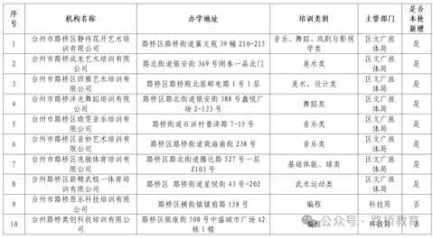 经区科技局、区文化广电旅游体育局认定,现将路桥区科技类、文化艺术类、体育类校外培训机构“白名单”予以公布。 路桥区非学科类校外培训机构“白名单” 来源:路桥教育
