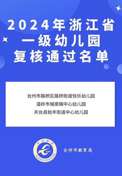 近日,省教育厅公布2024年浙江省一级幼儿园认定和复核通过名单,认定260所幼儿园为浙江省一级幼儿园。同时对2019年发文认定和2023年申请延期复核的一级幼儿园进行了复核,认定35所省一级幼儿园通过复核。其中,台州28所幼儿园入选名单,一起来看看~ 来源:台州教育