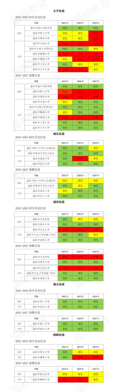 按照《浙江省教育厅关于建立义务教育阶段公办学校户籍生入学信息发布和预警机制的指导意见》规定,温岭市教育局根据我市五个街道公办义务教育学校2022-2024年学区内户籍儿童入学数据和2025-2027年学区内户籍儿童信息(户籍数据截至2024年12月),现向社会发布各相关学校2022-2024年招生信息和2025-2027年预警信息。 预警等级 红色预警,表示学区内适龄户籍儿童人数达到或超过学区学校