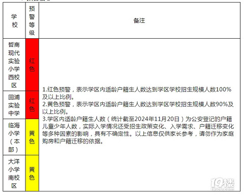 根据《浙江省教育厅关于建立义务教育阶段公办学校户籍生入学信息发布和预警机制的指导意见》(浙教基〔2018〕100 号)要求,临海市教育局采集了各公办义务教育学校学区适龄儿童少年户籍人数,结合学校办学规模,现将市区部分公办义务教育学校2025年新生入学预警信息公布如下: 一、预警信息 二、分流方案全面落实“公民同招”相关规定,公办义务教育学校依法保障户籍已迁入学区内的适龄儿童少年优先招生,有空余学位