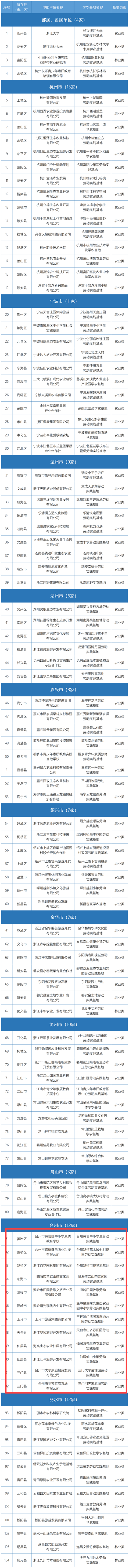 近日,省教育、农业、林业三部门联合发布《浙江省中小学劳动实践基地(第三批)暨学农基地名单》。经组织专家评审和综合评定,认定长兴浙江大学劳动实践基地等104家基地为浙江省中小学劳动实践基地(第三批)暨学农基地。其中,台州共有12家入选,一起来看~ 浙江省中小学劳动实践基地(第三批) 暨学农基地名单(共104家) 来源于台州教育