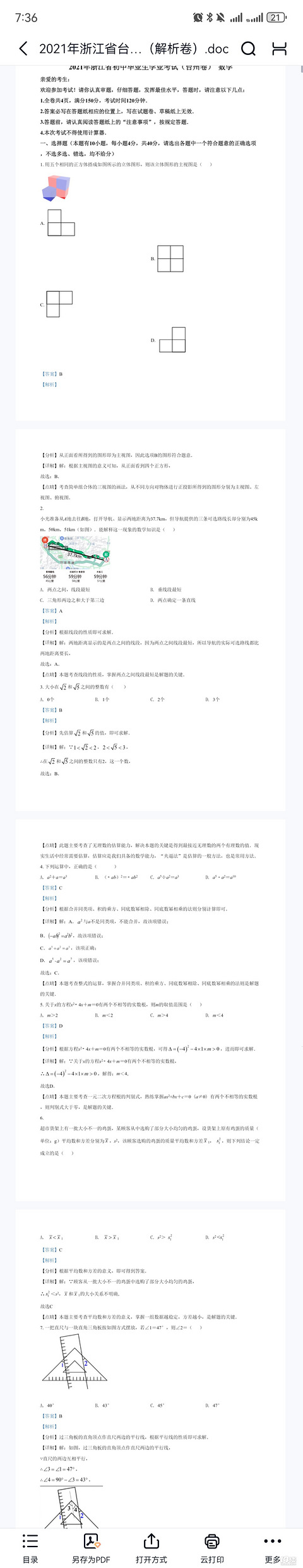 21年中考作业考试台州卷数学(附答案)