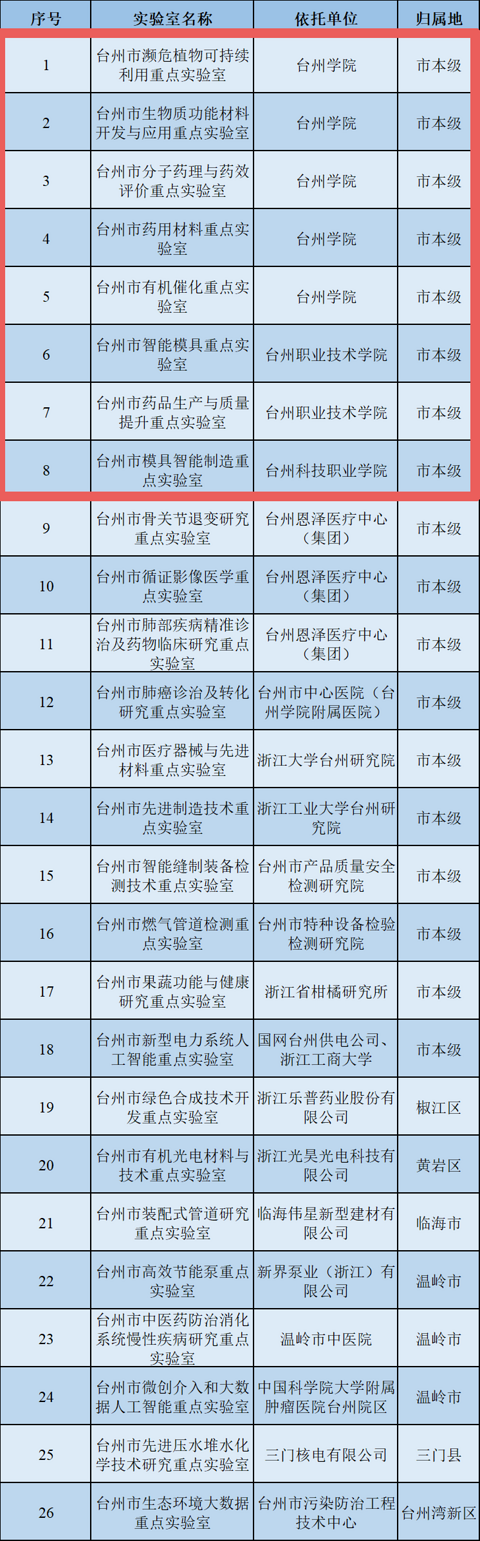 台州市重点实验室,高校8家!