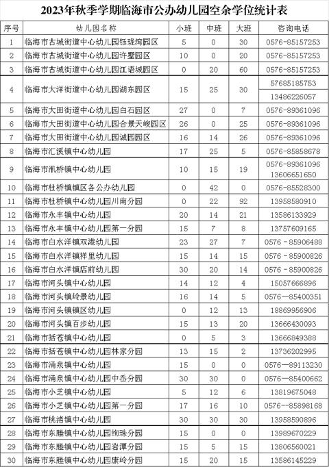 临海市教育局公布2023年秋季学期公办幼儿园空余学位