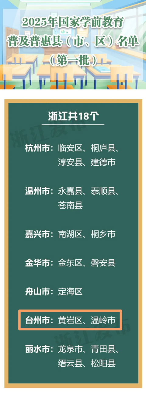 近日,教育部印发通知,公布2025年国家学前教育普及普惠县(市、区)名单(第一批)。其中,台州2地入选。一起来看看~ 来源:浙江发布