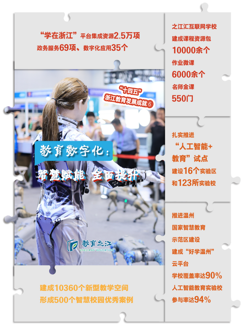 凝心聚力,逐光而行“十四五” 期间浙江锚定教育现代化目标在学段与规模、公平与均衡、普及与质量、开放与交流等领域写下浓墨重彩的答卷通过8张“拼”图看浙江教育精彩画卷 来源:教育之江