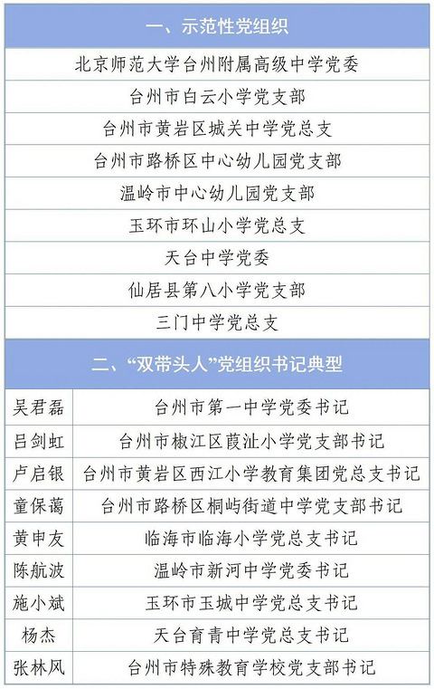 近日,省教育厅公示第三批省中小学校示范性党组织和“双带头人”党组织书记典型拟确定名单。经设区市教育局推荐、省级复核,拟确定99个党组织为第三批省中小学校示范性党组织,99名同志为第三批省中小学校“双带头人”党组织书记典型。其中,台州9个党组织、9名同志上榜。一起来看看~ 第三批省中小学校示范性党组织和“双带头人”党组织书记典型拟确定名单(台州) 来源:省教育厅官网