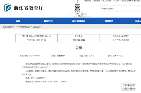 8月4日,浙江省教育厅网站发布公示称,根据高校设置有关规定及要求,现将绍兴文理学院更名为绍兴大学、湖州师范学院更名为湖州师范大学向社会公示,公示时间为2025年8月4日至2025年8月8日。 来源台州交通广播