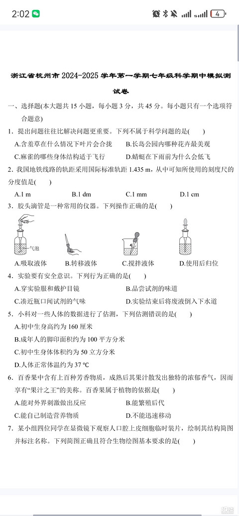 七年级(初一)科学期末卷,给娃看看会不会做