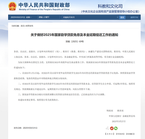 3月31日,《关于做好2025年国家助学贷款免息及本金延期偿还工作的通知》发布。 通知指出,为加大保障和改善民生力度,支持做好2025年高校毕业生就业服务工作,现就做好2025年国家助学贷款免息及本金延期偿还工作通知如下: 一、自2025年1月1日起,对2025年及以前年度毕业的贷款学生2025年内应偿还的国家助学贷款利息予以免除,参照国家助学贷款贴息政策,免除的利息由中央财政和地方财政分别承担。