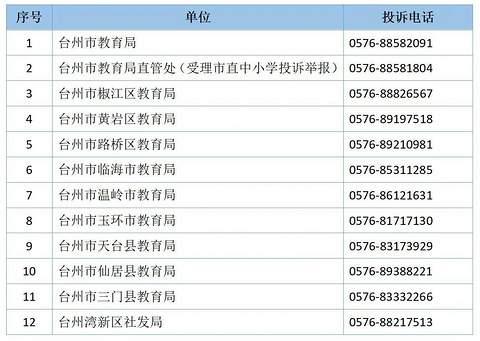 为深入推进中小学食品安全与膳食经费专项整治工作,确保工作成效,现将市本级和各县(市、区)教育局、台州湾新区社发局的投诉举报电话向社会公开,接受广大群众监督。 台州市中小学食品安全与膳食经费专项整治投诉电话 来源台州教育