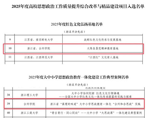 近日,教育部印发通知,公布2025年度高校思想政治工作质量提升综合改革与精品建设项目入选名单。台州学院共有2个项目入选,这也是该校首次获得该项目的国家级立项。 入选名单截图 其中,“大陈岛垦荒精神教育基地”入选“2025年度红色文化弘扬基地”,也是浙江省高校唯一入选教育部该类别项目;同时,“浙江省‘真理的味道’大中小学思政教育一体化‘台州和合思政’实践”入选“2025年度大中小学思想政治教育一体化