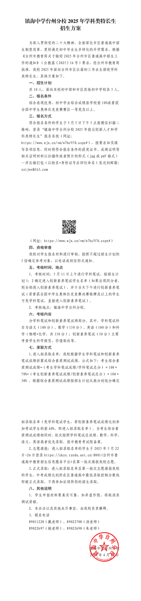 镇海台州分校25年拔尖创新人才特色招生和学科类特长生招生方案