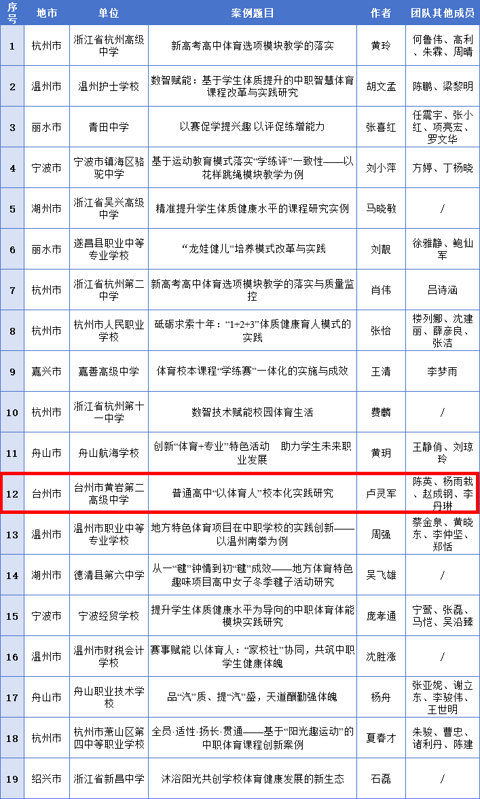 近日,浙江省教育厅网站发布《关于浙江省高中学生体质健康管理典型案例的公示》,经各地推荐、省级遴选,拟确定78个浙江省高中学生体质健康管理典型案例。其中,台州8个案例入选。一起来看看~ 浙江省高中学生体质健康管理典型案例名单(行政部门体质管理类) 浙江省高中学生体质健康管理典型案例名单(高中学校课程建设类) 浙江省高中学生体质健康管理典型案例名单(高中学校体质干预类) 来源台州教育