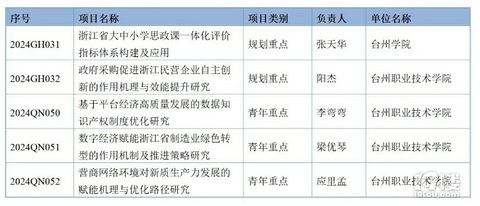 近日,省教育厅公布2023-2024年度浙江省高校重大人文社科攻关计划项目,经高校申报、专家评审,确定109个项目为2023-2024年度浙江省高校重大人文社科攻关计划规划重点项目,182个项目为青年重点项目。其中,台州5个项目入选名单。 一起来看名单↓↓↓2023-2024年度浙江省高校重大人文社科攻关计划项目立项名单(台州) 省教育厅就加强项目实施和管理工作提出以下要求—— 一、项目依托高校应