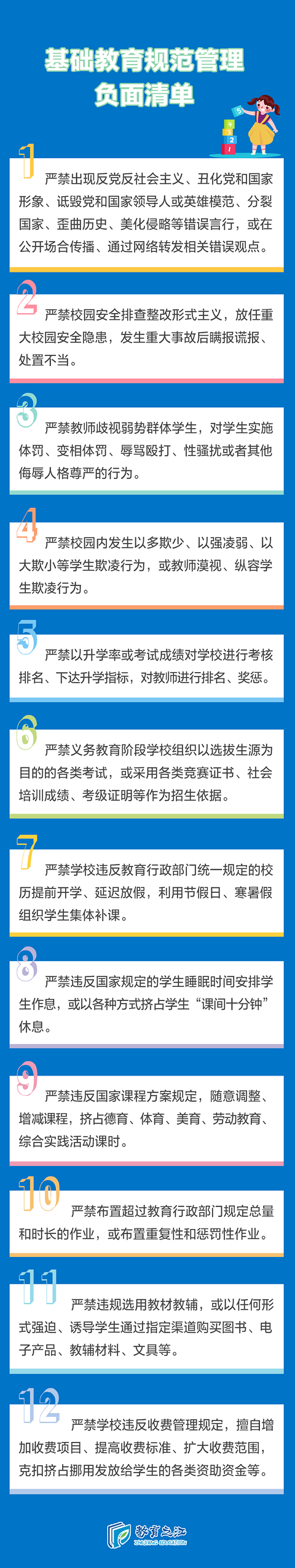 近日,教育部办公厅印发《关于开展基础教育“规范管理年”行动的通知》,对开展基础教育“规范管理年”行动的工作目标、规范整治重点、实施步骤、健全工作机制等方面提出要求。《通知》列出了12项基础教育规范管理负面清单,一起来看↓↓ 基础教育规范管理负面清单 建立监督曝光机制和声誉评价制度 教育部要求各地即日起启动实施,完善细化好负面清单,全面自查整改,还将通过跨市县交叉调研、责任督学进校、专业力量视导等方