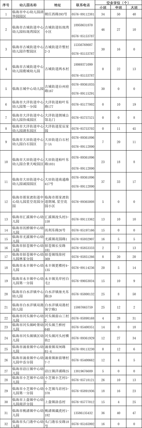 2024年临海市秋季招生公办幼儿园空余学位公告