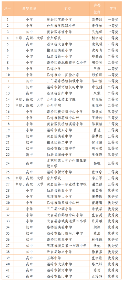 近日,中共台州市委宣传部、台州市教育局公布台州市第二届大中小学思政课一体化课堂教学评比获奖名单。经专家评审,评出龚梦甜等5位教师获一等奖、沈丹青等10位教师获二等奖、潘敏仙等12位教师获三等奖、张笑菁等15位教师获优秀奖,其中获一、二等奖的课堂教学被认定为“台州市大中小学思政课一体化示范课”。一起来看看~ 台州市第二届大中小学思政课一体化 课堂教学评比获奖名单 来源台州教育
