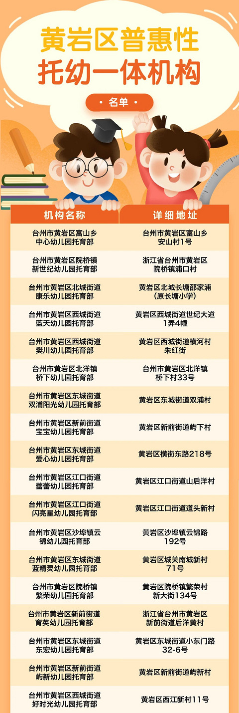 近日黄岩区公布了普惠性托育机构全名单 普惠托育是公共服务领域的新热点,这三年,从国家到地方,出台了一系列鼓励性的托育政策,为了解决“入托难、入托贵”的问题,黄岩区结合实际出台了《黄岩区普惠性托育机构认定标准(试行)》,积极落实《黄岩区普惠托育基本公共服务财政奖补实施方案(试行)》,为群众提供就近可及、普惠优质的托育服务。 ▼详情如下▼ 一、 全日托每人每月不超过2450元 今年8月底,黄岩区卫健、