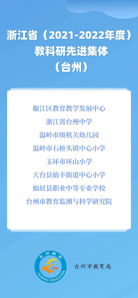 近日,浙江省教育科学研究院公布浙江省(2021—2022年度)教科研先进集体和先进个人名单。其中,台州共有8家单位、13名个人成功入选。一起来看看~ 来源:台州教育