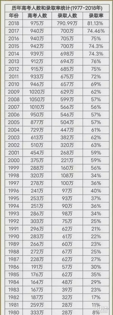 1977年以来历年高考报考人数、高校录取人数和录取比例一览表