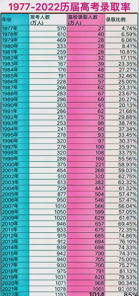 ?梅子谈动物2023-06-27 11:27 ·山东21991年之前的大学生才叫天之骄子!看看各年大学的录取人数,不用看录取比例,只看总人数就可以了,当年全国就挑出了这么多人!1991年之前,录取人数最多就是六十多万,最少只有二十多万,那才叫择优录取,如果没有复读的话,不用想都是智商顶尖的学生,天之骄子名副其实。91年以后就开始注水了,录取比例人数逐年提高,现在的话如果不是211基本上就没什么含金