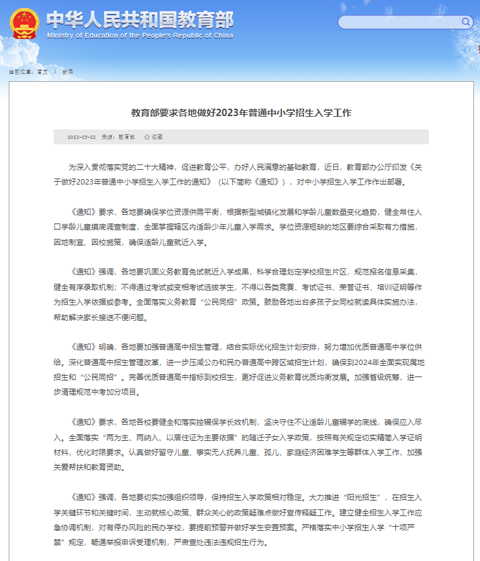 教育部:义务教育不得通过考试或变相考试选拔学生 为深入贯彻落实党的二十大精神,促进教育公平,办好人民满意的基础教育,近日,教育部办公厅印发《关于做好2023年普通中小学招生入学工作的通知》(以下简称《通知》),对中小学招生入学工作作出部署。 《通知》要求,各地要确保学位资源供需平衡,根据新型城镇化发展和学龄儿童数量变化趋势,健全常住人口学龄儿童摸底调查制度,全面掌握辖区内适龄少年儿童入学需求。学位