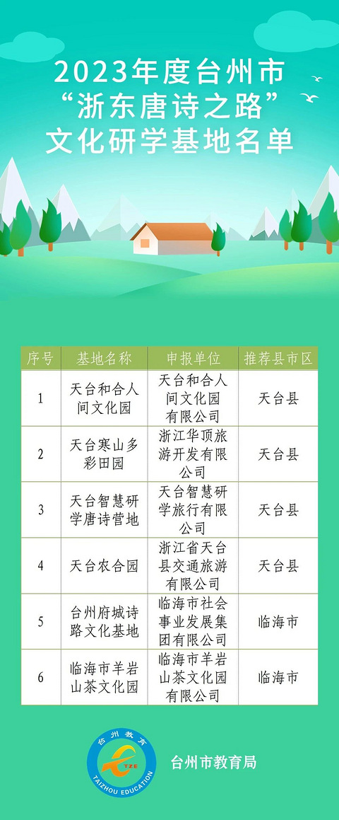 近日,市教育局、市文化和广电旅游体育局公布台州市第四批中小学生研学实践教育基地、2023年度台州市“浙东唐诗之路”文化研学基地名单。经材料审核、实地踏勘、专家评审、综合评定、公示公告等程序,认定台州市高速公路交通安全研学基地等13家单位为台州市第四批中小学生研学实践教育基地,天台和合人间文化园等6家单位为2023年度台州市“浙东唐诗之路”文化研学基地。一起来看看~ 来源台州教育