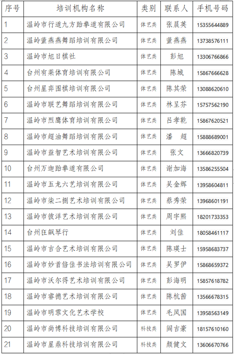 各义务教育学校,各相关培训机构: 根据《浙江省教育厅关于遴选非学科类外培训机构参与学校课后服务工作的指导意见》文件精神和《温岭市“双减”工作专班关于遴选非学科类校外培训机构参与学校课后服务工作的通知》文件要求,经培训机构自主申报、专家审核,报市教育局党委同意,现将我市非学科类培训机构参与学校课后服务第一批“白名单”公示如下: 其他说明: 1.公示时间2022年9月14日至9月20日,如对公有异议,