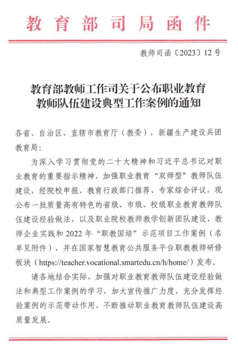 近日,教育部教师工作司公布“职业教育教师队伍建设典型工作案例”,评选出64个省级、市级、校级职教教师队伍建设经验做法、47个职教教师队伍建设典型工作案例。其中,台州职业技术学院、温岭市职业技术学校的案例入选为学校教师队伍建设经验做法。 《师德为先 多元引培 打造双师型教师队伍》 台州职业技术学院 台州职业技术学院紧跟经济社会发展需求,开辟了高职院校新时代“双师型”教师队伍建设的新路径,形成了以坚