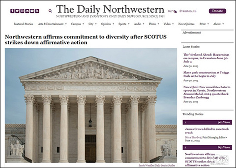 中国侨网 2023-07-02 08:40去App听语音播报转自:中国侨网当地时间6月29日,美国最高法院裁定哈佛大学和北卡罗来纳大学基于“平权”在招生中考虑种族因素的做法违反美国宪法。在裁定宣布后,美国多所名校纷纷发声,对美国最高法院表示不满,并声称将继续坚持此前的“多元化”政策。美国西北大学校报发文评论美最高法院裁定,截图自网络所谓“多元化”政策,是指美国社会在入学、招聘时除了考察求学和求职者