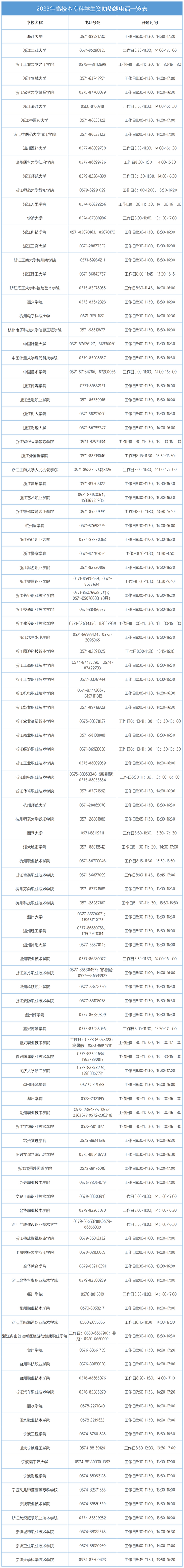 近日,省教育发展中心公布了 2023年我省各市县、 全日制普通高校、 省属高中学校资助管理部门咨询电话 以及浙江省生源地助学贷款办理网点咨询电话 浙江省教育发展中心资助咨询电话 0571-88008844、88008845 电话全年开通工作日8:30-12:00,13:30-17:00一起来看咨询电话↓↓↓ 1、2023年市县学生资助热线电话 2、2023年高校本专科学生资助热线电话 3、2023
