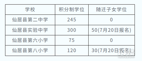 一、报名时间7月8日至7月9日(6:00-22:00) 二、报名学校 小学:仙居县第六小学、仙居县第八小学初中:仙居县第二中学、仙居县实验中学 三、报名条件 1.小学:2016年9月1日至2017年8月31日出生且其父母积分达到72分及以上的学区外入学对象(非仙居籍的其父母须取得《浙江省居住证》)。 2.初中:父母积分达到72分及以上(非仙居籍的其父母须取得《浙江省居住证》)的学区外小学应届在籍毕