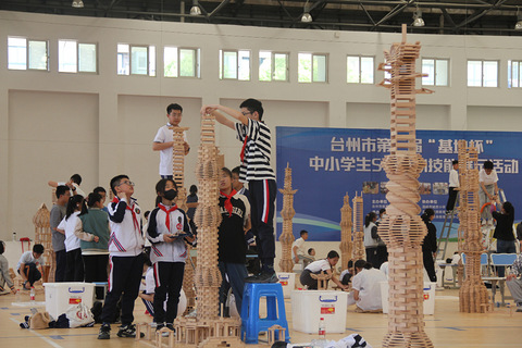 5月13日,台州市第三届“基地杯”STEAM技能展示活动在温岭举行,市教育局二级调研员张江到场指导。 此次活动面向台州市四年级至八年级学生,分为“KEVA搭建”“液压机械制作”两项赛事,共有66队参加“KEVA搭建”项目,17队参加“液压机械制作”项目。 “KEVA搭建”比赛现场 “KEVA搭建”要求创作一个以“塔”为主题的整体创意作品。每个参展小组4位成员,在限时100分钟、限量1000片KE