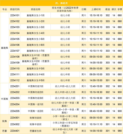 2022年秋季报名公告 报名时间2022年8月8日开始到8月26日,报满即止。 01早教类 02科技类 03音乐类 04舞蹈类 05书画类 06棋艺类 07体育健身类 08小主持人类 09成人类 报名阶段 第一阶段|老生续报2022年8月8日8:30—8月9日16:30,老生报原暑期在读班级的升级班。老生凭注册信息(姓名及手机号)登录报名系统完成缴费即视为报名成功