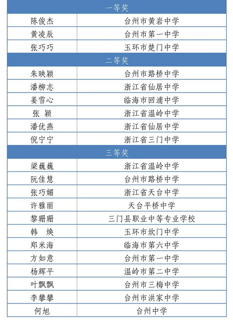 近日,台州市第十届中小学班主任基本功大赛在天台举行。通过主题班会、育人故事、带班方略和面试,经评委评定,天台县天台小学范园媛等71名教师分别获得班主任小学组、初中组、高中组综合评选一、二、三等奖。一起来看~ 台州市第十届中小学班主任基本功大赛 综合评选获奖名单 小学班主任组 初中班主任组 高中班主任组 来源台州教育
