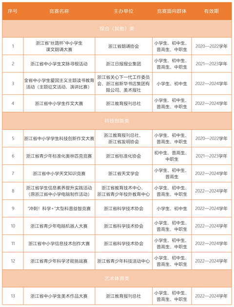 最新!浙江公布2022年进入中小学校的全省性竞赛项目名单