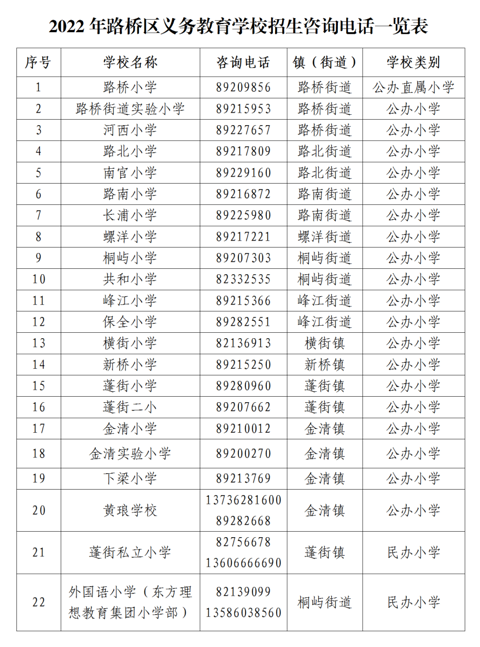 根据台州市教育局的统一安排,今年路桥区义务教育学校网上报名时间为:7月3日6:00—7月5日22:00。近日,路桥区教育局印发《关于做好2022年路桥区义务教育学校阳光招生工作的通知》《路桥区2022年义务教育学校招生入学工作安排表》。现将主要内容发布如下: 关于做好2022年路桥区义务教育学校阳光招生工作的通知 1、政策依据 《中华人民共和国义务教育法》《浙江省义务教育条例》和《浙江省教育厅办公