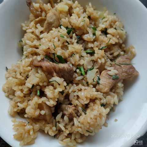 头天晚上剩下的猪肉饭,早上炒炒,就不用做饭了,简单方便,味道还不错,牛奶咕咕。