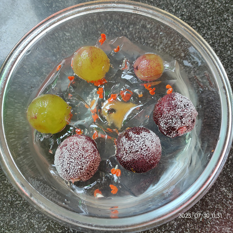天气热了,就想吃点凉快的,白凉粉安排起,中午的加了蜂蜜,杨梅,葡萄,雪碧,刚刚夜宵的加了蟠桃,杨梅,蜂蜜,雪碧,好好吃的呢!