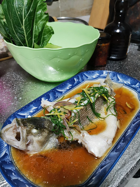大润发点的外卖,原价15.9一只的鲈鱼用了优惠券,实付8元多还是很新鲜的,可以免费宰杀但自己得好好洗葱姜水泡20分钟大火蒸汽上来蒸八分钟再淋油,再来个爆炒洋葱酱油汁
