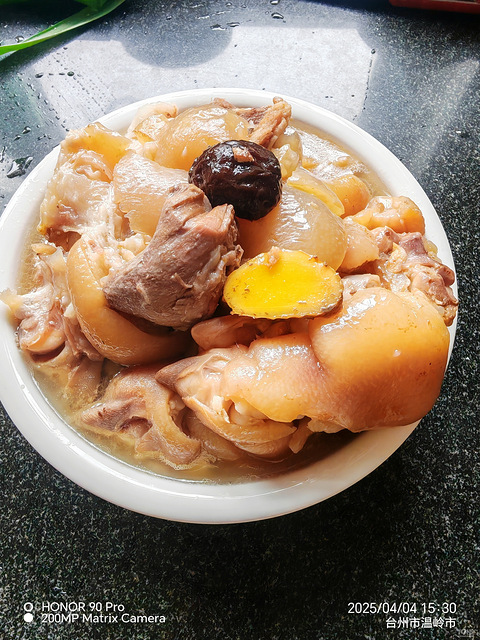 这个猪脚我姨给的,说表哥和朋友一起去仙居山里面杀了一头猪,说这个家养的猪肉香,我就焯水,趁热刮毛和不能要的那些,再洗干净,放电压力锅,生姜,红糖,老酒,水,四个香菇干,就这些,蹄髈功能,煮好了加盐,开盖收汁一下,就可以吃了,味道还真的不错的。