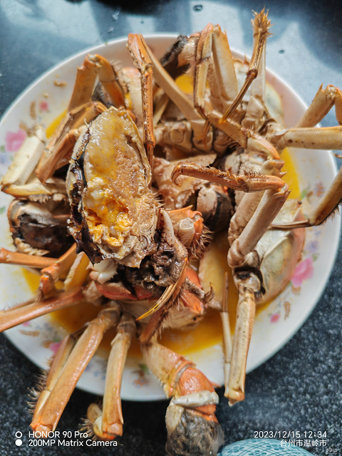 这次的田蟹非常好,都是满膏,很壮啊!洗干净切断,去蟹胃,油锅七成热下蟹,煎几分钟,放盐,老酒,倒水,煮开再煮五六七八分钟,可以了