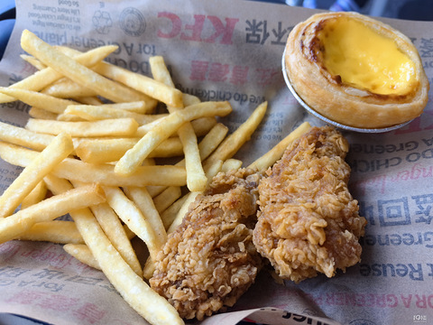 肯德基套餐来一个,奥尔良鸡腿堡,鸡翅,薯条,蛋挞,可乐,原价57.5元,优惠后34.9元二楼位置不错,看窗外人来人往