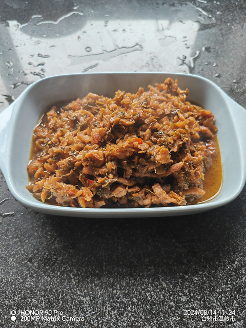 之前外婆菜炒肉丁,说看不到肉,这次切成肉丝,就明显了,肥肉煸出油再放瘦肉,煸香放外婆菜,炒炒炒,加点老酒,加一点水,煮开就可以了,放点鸡精拌一下就可以出锅了
