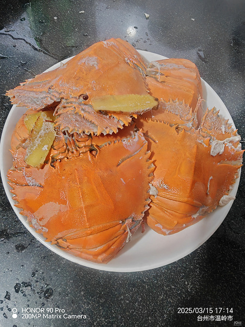 又到了吃田蟹的季节,膏黄,肥美,早上买了五只,中午三只晚上两只,田蟹用刷子洗干净,切两段,拿掉胃囊,热锅热油,放入田蟹,姜片,煎一下,一圈老酒,适量盐,加热水煮开再煮五六分钟就好了