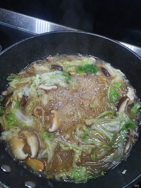 这家店好多年前吃过一次,也没怎么看到有推广啥的,但生意挺不错的,大部分人都说味道还可以。点了个精品鸡煲,比普通鸡堡贵一点,肉不是非常多。除了鸡煲还有其他煲的。加汤之后可以下点配菜,配菜在冰柜里自己拿。千张,年糕放进去烧都挺好吃的。