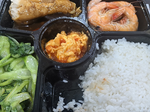 天气热了也不想做饭,吃盒饭省事省钱,有鸡腿,有虾,有蛋,有蔬菜 西瓜真甜