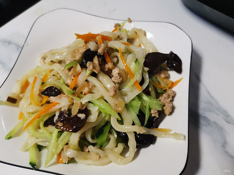 随便搞点菜拌一拌,胡萝卜,黄瓜,木耳,香菇肉沫,手擀面,洋葱!!!十五分钟搞定!