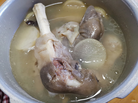 冬天了,买了点小羊脚蹄炖一炖清洗后,泡水2-3小时焯水后,直接清水,白萝卜桂皮香叶茴香等高压锅炖煮大火呲呲后,40分钟小火慢炖脱骨得很,这胶原蛋白彭彭的